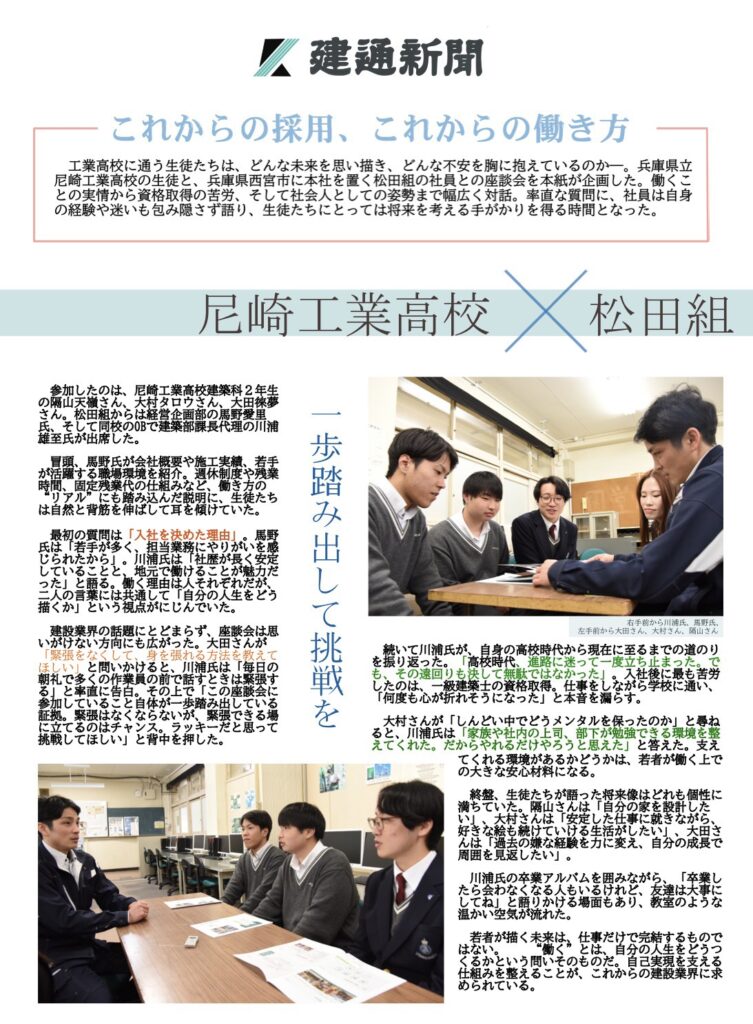 建築科2年生の学生3名に、建設業や自社の魅力、資格取得の苦労などを包み隠さずお伝えしました
