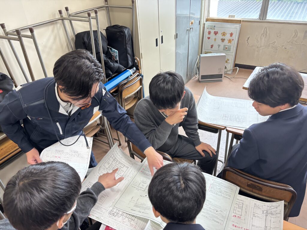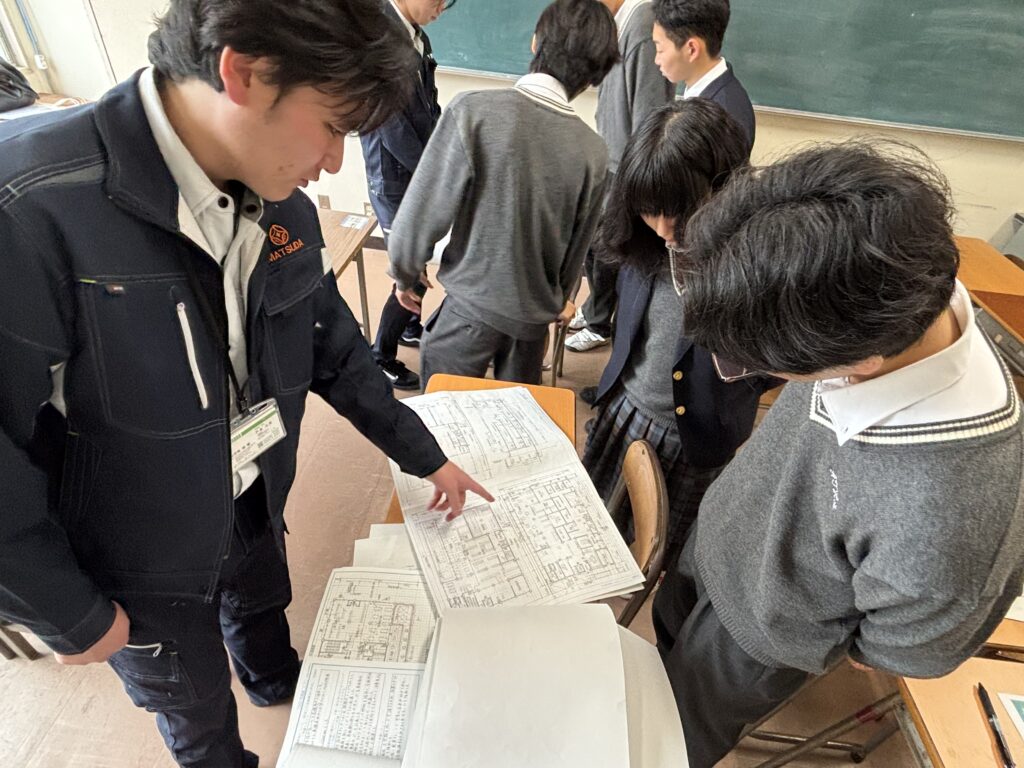 進路選択に関するアドバイスや、よりイメージしてもらえるよう社員が書いた製図の紹介なども行いました。